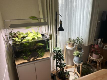 こちらの写真は水草と流木でレイアウトした水槽です。10種類の熱帯魚が暮らしており、中心から生えている大きな植物が特徴的な水槽になります。植物溢れる環境で魚が優雅に泳いでいると心が癒されます。そして、観葉植物にもハマっており、水槽の廻りに緑が生い茂っています。
