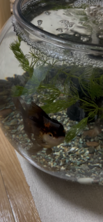 こちらは最近飼育し始めた金魚(オランダシシガシラ)になります。大きい金魚鉢で飼育しており、とても愛嬌があってかわいいです。レイアウトはシンプルにして魚メインの水槽にしています。