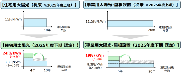 これまで、FIT制度(固定価格買取制度)では、10kW未満の住宅用、10kW以上の事業用ともに、一定期間(10年・20年)固定価格の買取単価が設定されていましたが、今後は、期間内の一部で買取単価が変更となる形となりました。